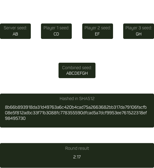 When round starts, game merges server seed with three client seeds. From merged symbols is generated SHA512 hash, and from this hash - game result.